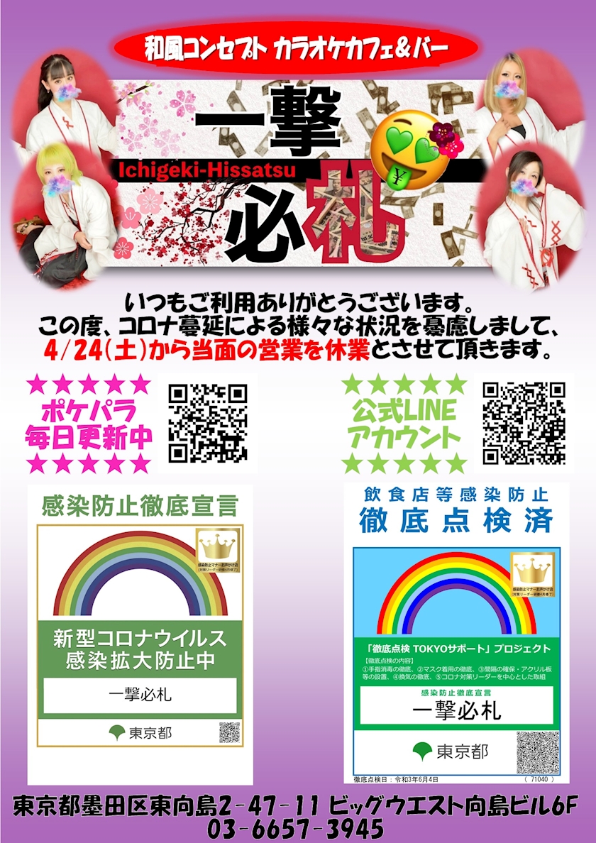 【お知らせ】緊急事態宣言に伴う休業期間延長について - 一撃の阿久津 - 一撃必札・イチゲキヒッサツ - 曳舟・押上のコンカフェ