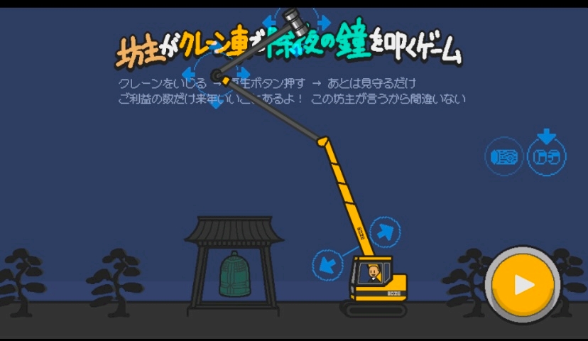 坊主がクレーン車で除夜の鐘を叩くゲーム