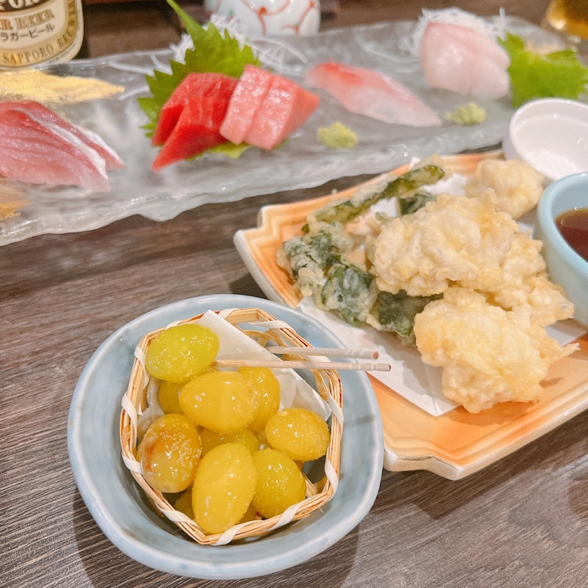 お刺身と銀杏と白子の天ぷらさん😌