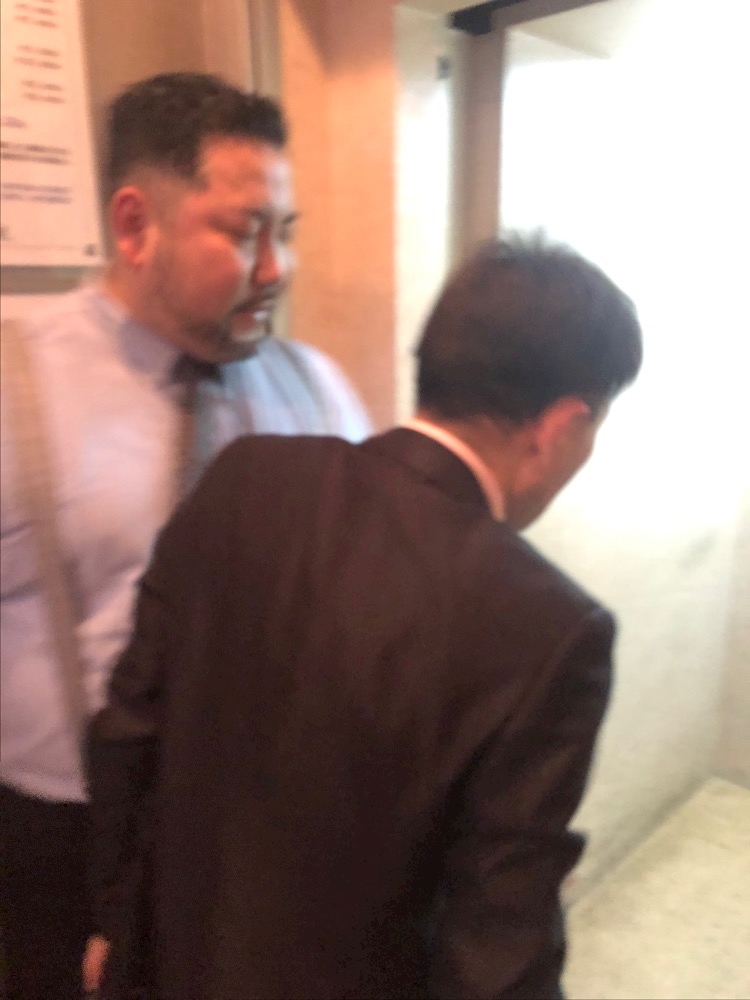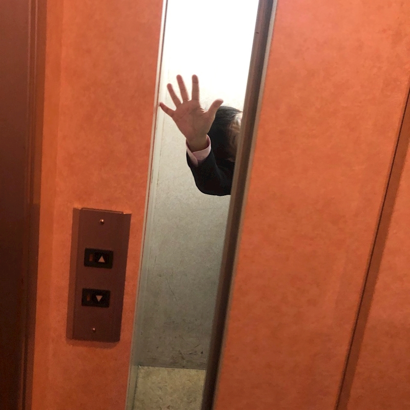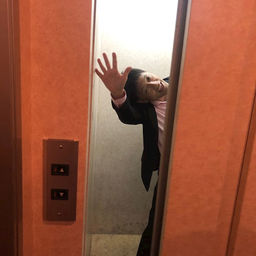 エレベーターに乗り込むマティさん