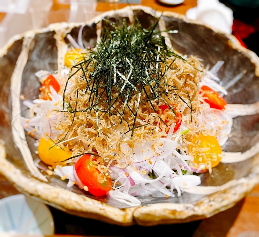 お任せコースで頼んでしまったので、メニューの正式名称あいまいなんですけど、大根とじゃこと水菜のサラダです😊