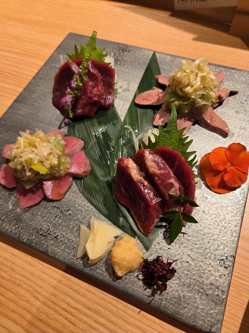 鴨刺しと馬刺し食べました✨