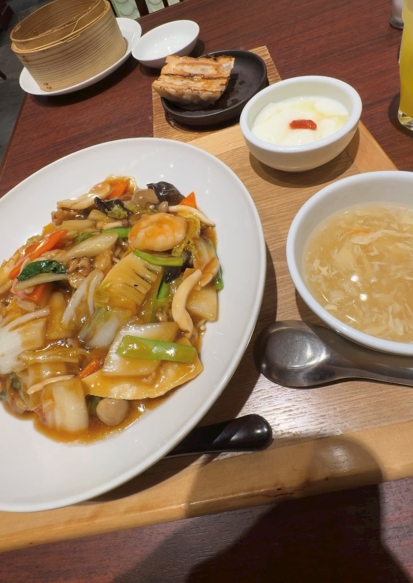 (五目焼きそば、手包み餃子、スーブ、杏仁豆腐)