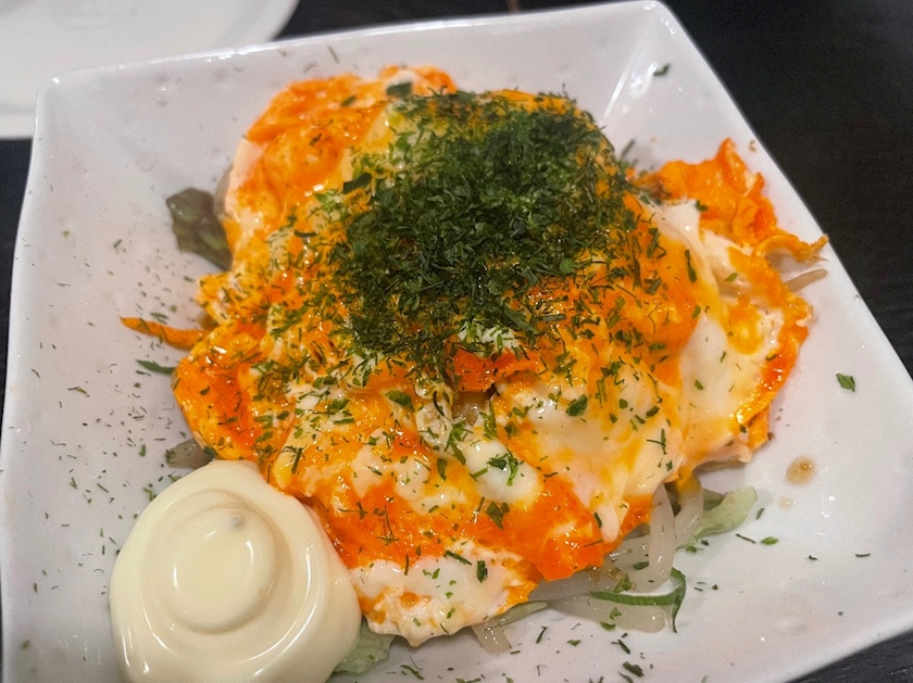 上にスクランブルエッグ