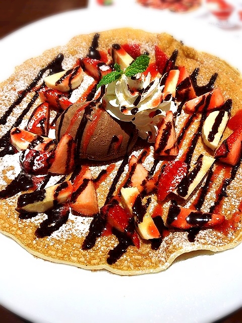食べ方よく分からなくて、とりあえずナイフでカットして、イチゴとバナナを適当に入れてアイスと生クリームも適量いれて、クレープみたいにして食べましたっ