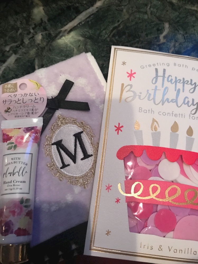 イニシャルの入ったタオルハンカチ、ハンドクリーム、入浴剤いただきましたー!!