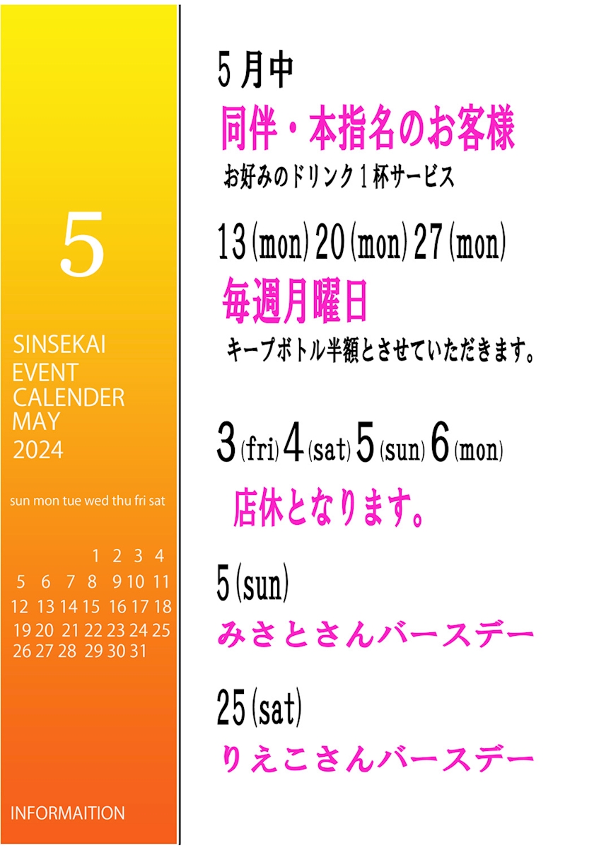 5月も新世界で『お得に飲めちゃう🍻』情報です😊