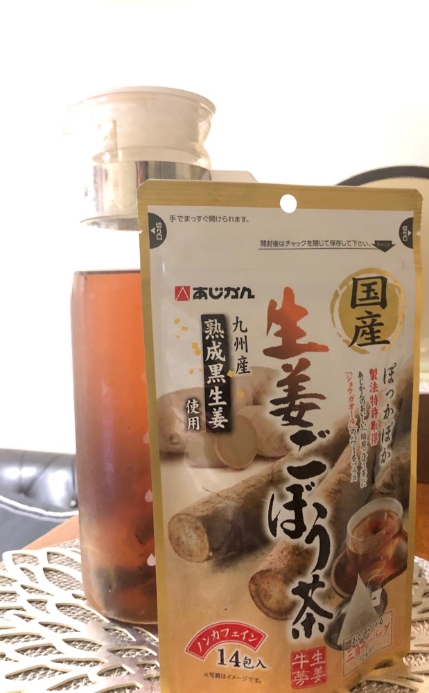 今は九州産の熟成黒生姜がブレンドされた生姜ごぼう茶を