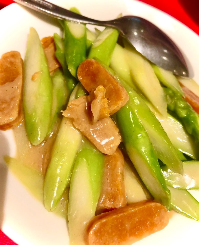 焼豚・くらげ・ふかひれ煮こごり・野菜の甘酢漬カラスミとアスパラ炒め