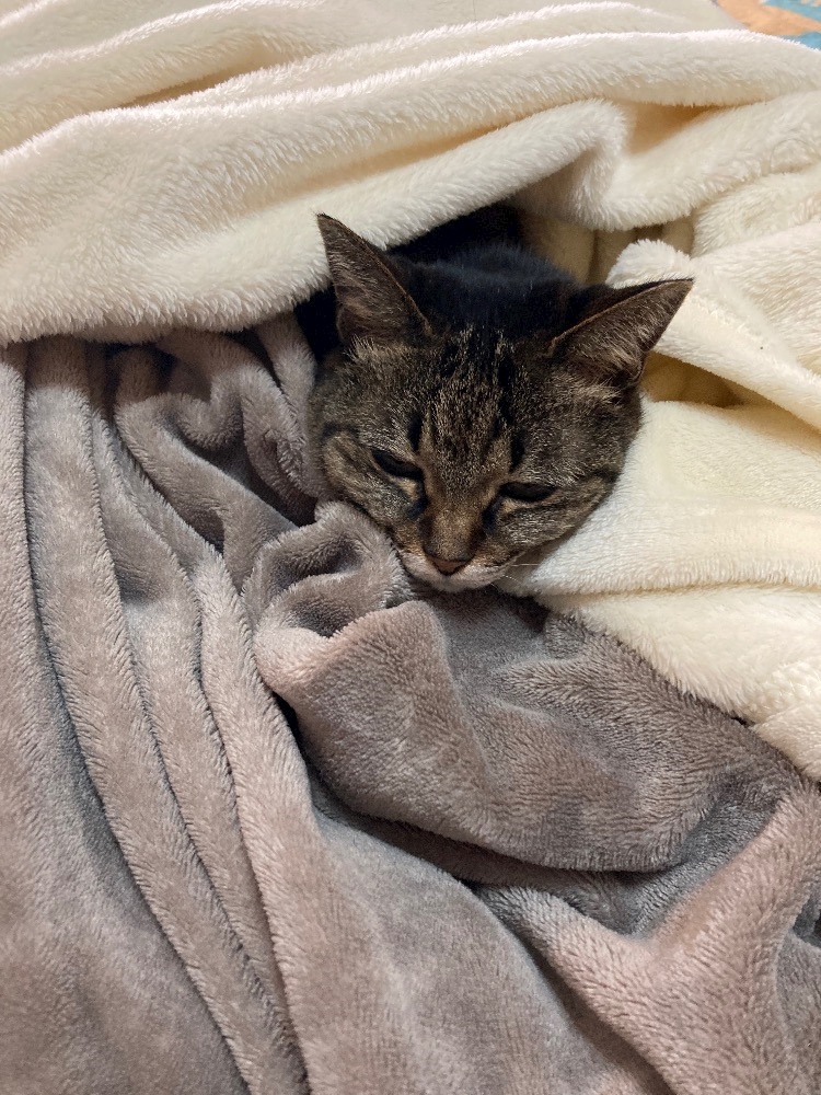 最近、ずっと寒いので毛布に包まるスタイルが多く🐱