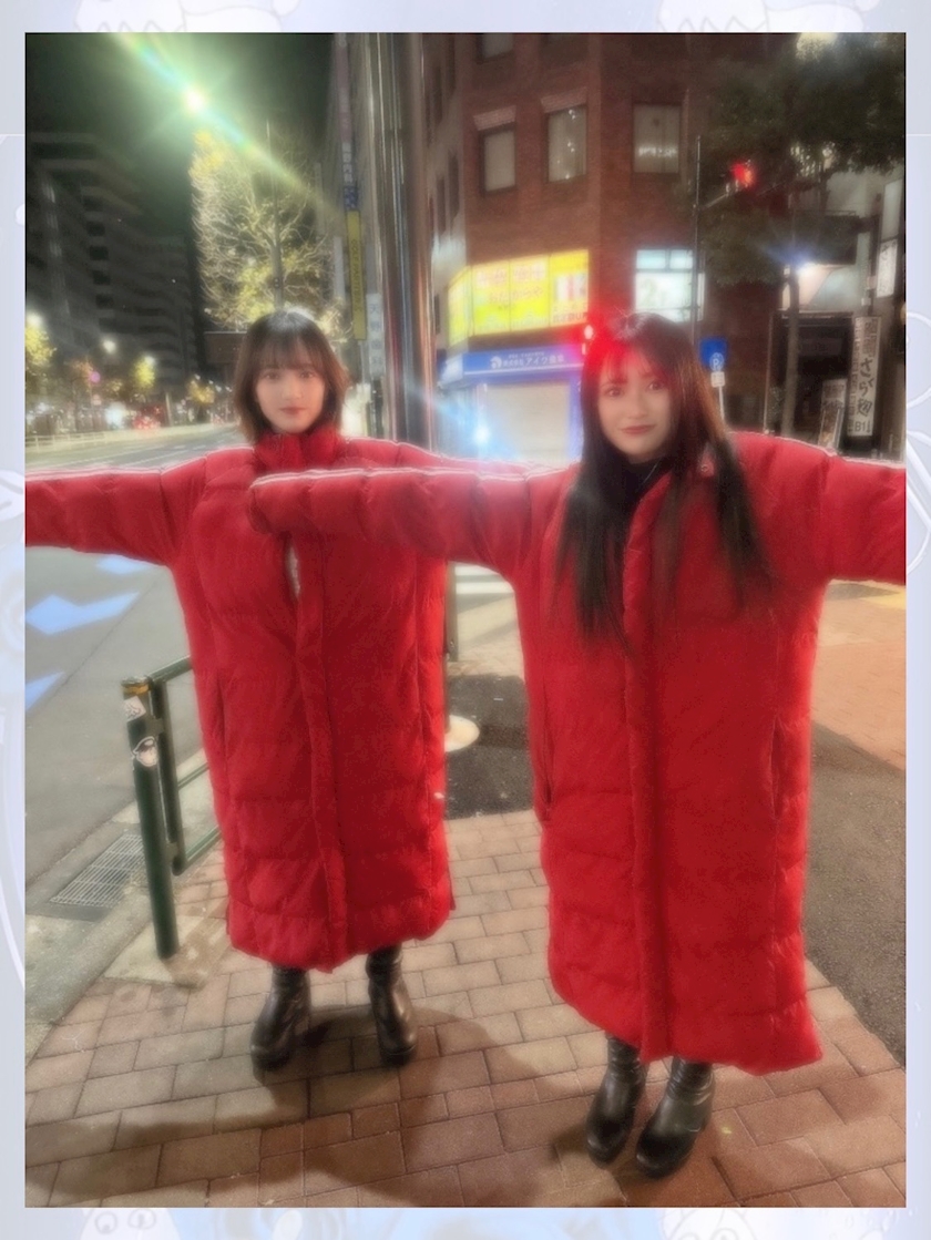 赤いベンチコートを着て