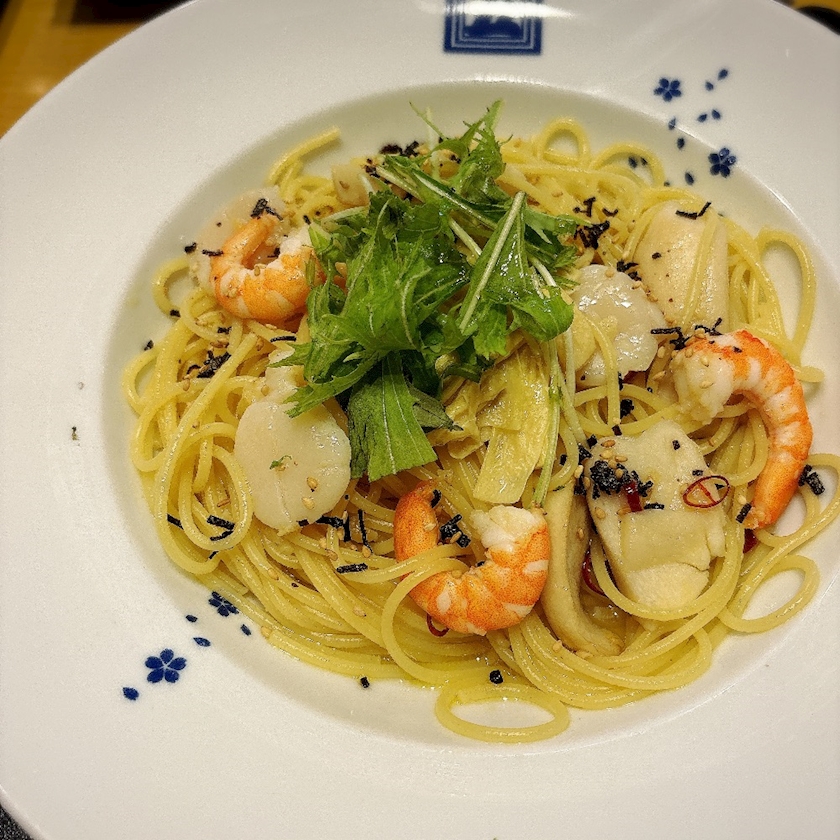 湯葉のホタテとエビのペペロンチーノ🦐