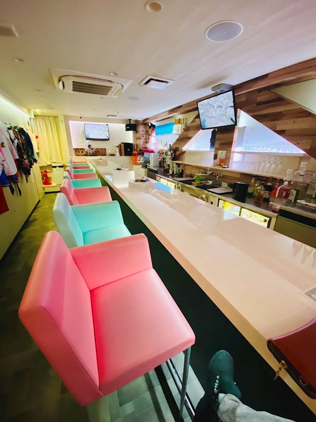全体的にパールトーンにまとめられたPOPな色合いの内装で、薄いピンクのカウンターテーブルに、ピンクと水色のカウンターチェアが交互に配置されており可愛かったです。
