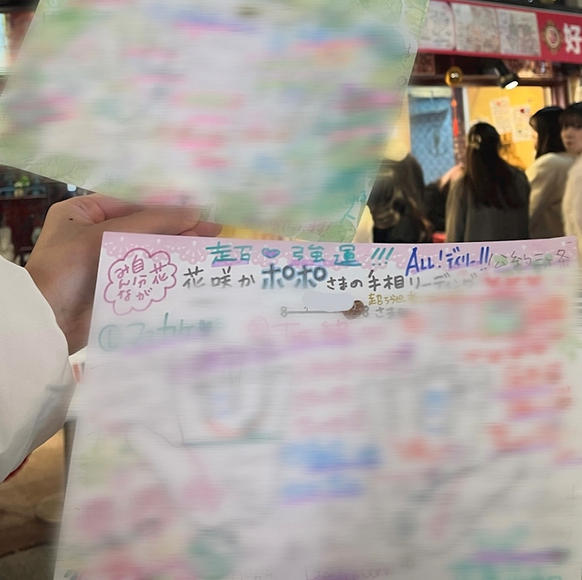 友達に誘われて、見てみたらぽぽ先生は紙に手相とその内容を書いてくれるのっ!!!😳