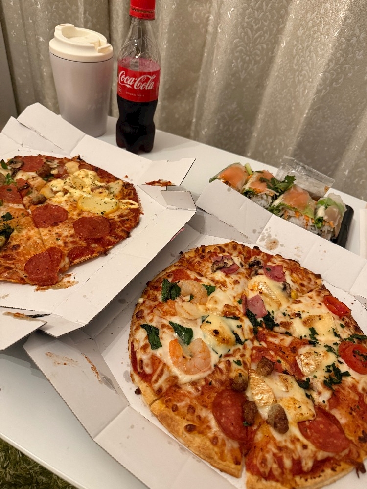 ピザにコーラにデザートまで食べて