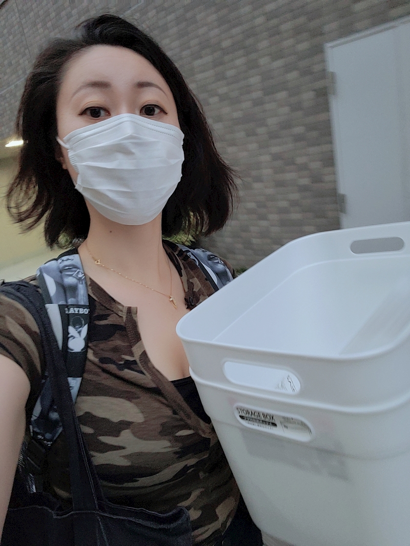 ジムの帰りに収納ケース買ったのですが、袋をもらい忘れて、そのまま持ちながら歩いて帰ったら、すごくシュールだったので、記念写真撮りました(笑)