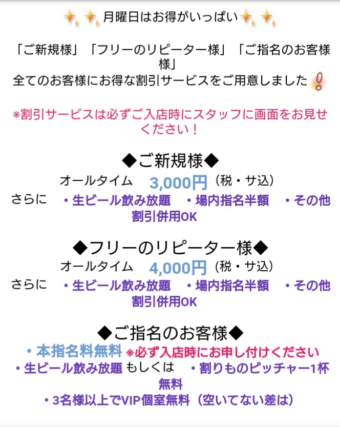 月曜日はとってもお得な日♪ - 女神アテナ - 新橋 キャバクラ・アテナ