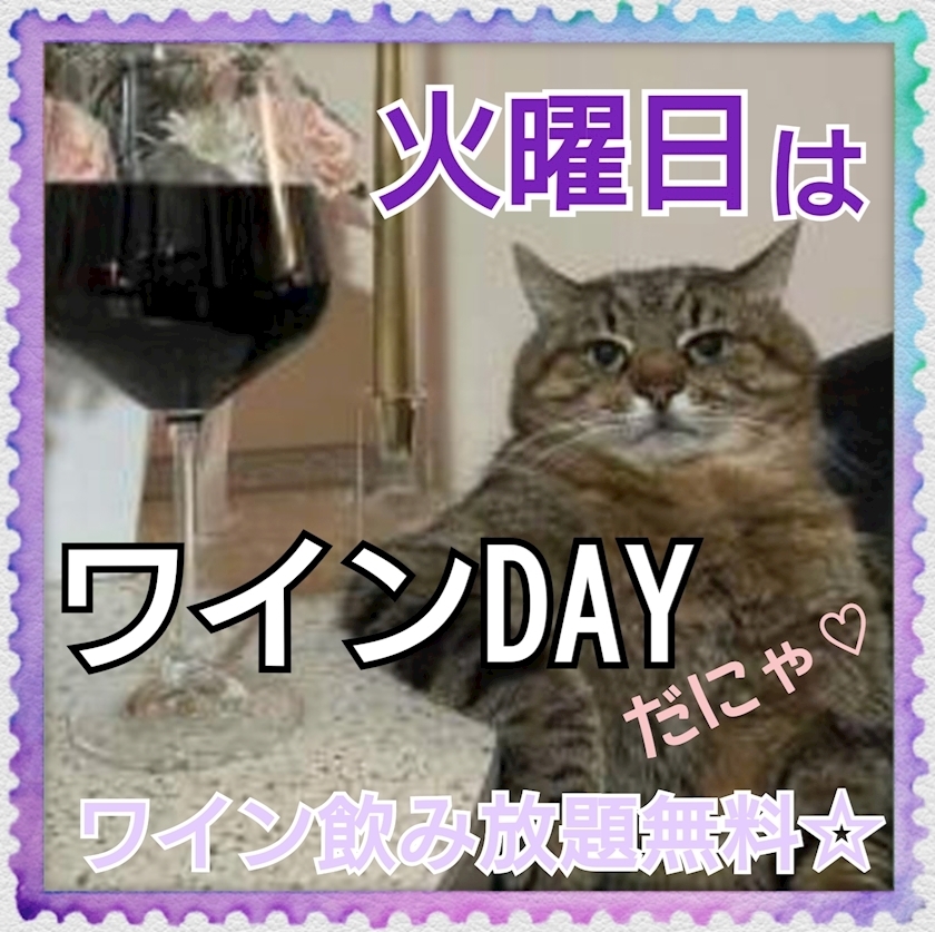 毎週火曜日は🍷ワイン飲み放題無料だにゃん🎶