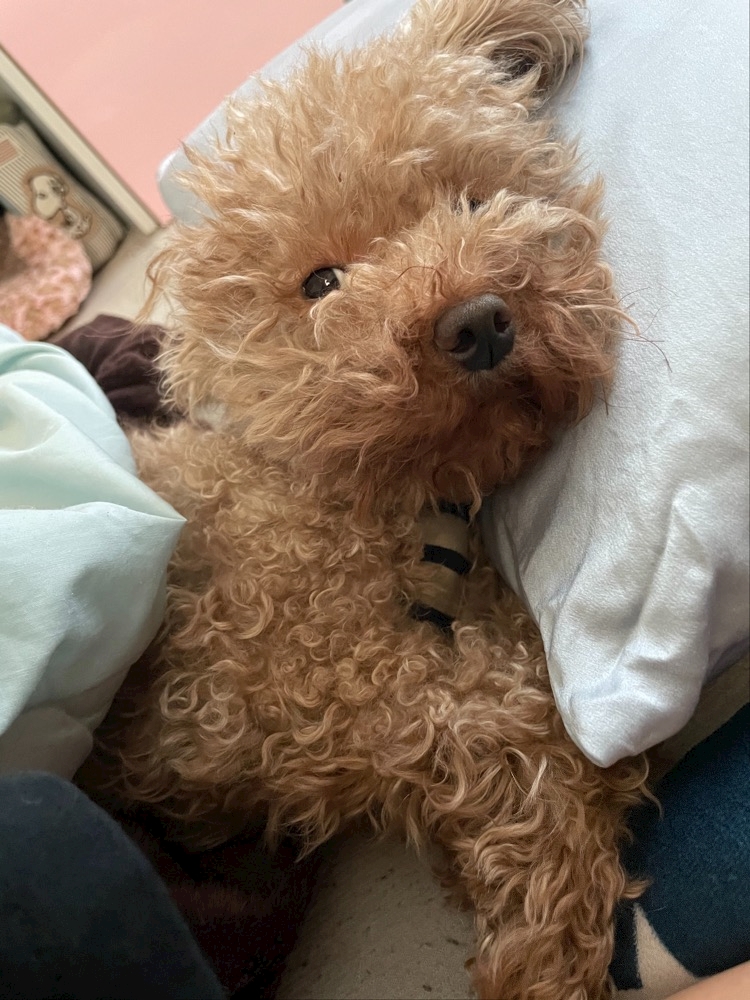 犬なのにシルクの枕カバーの枕で寝て布団掛けて寝る。