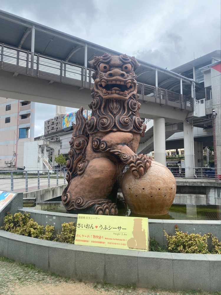 ホテルの最寄り駅の近くに大きいシーサーいました。