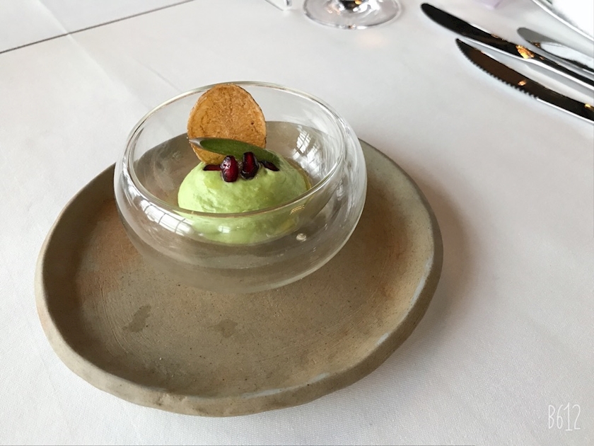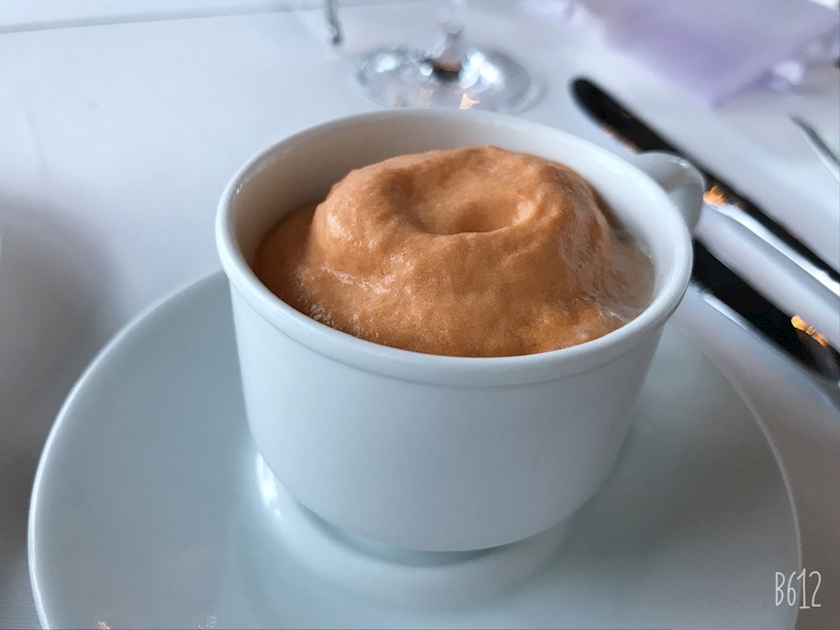 スープの上に、目の前でトマトムースを