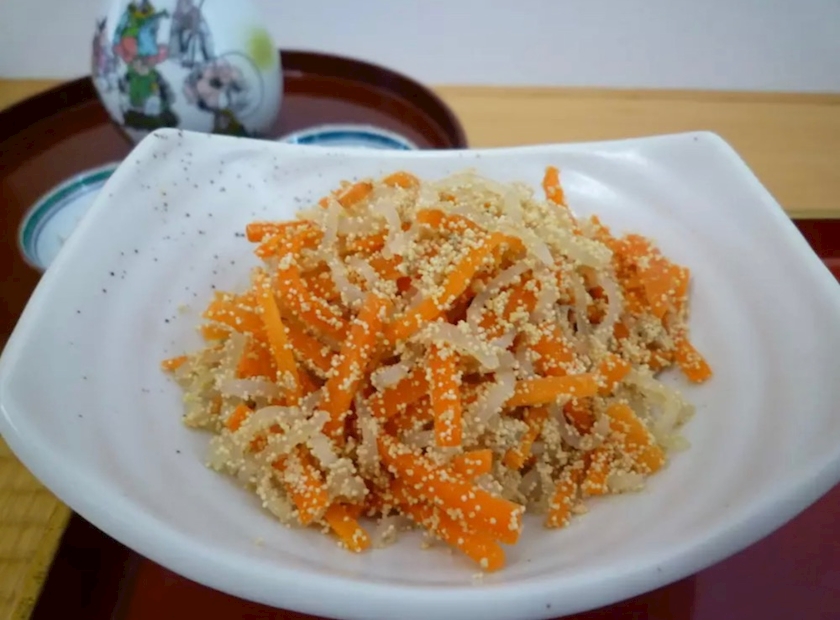 こんにゃくと人参とたらこを炒って作るんだけど、私は正月の料理の中で1番好き❤️