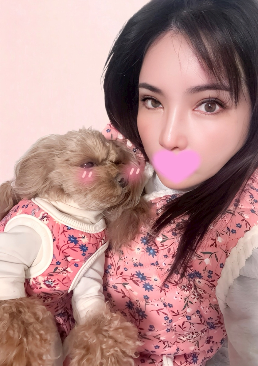 愛犬とお揃いのハルモニチョッキを着て