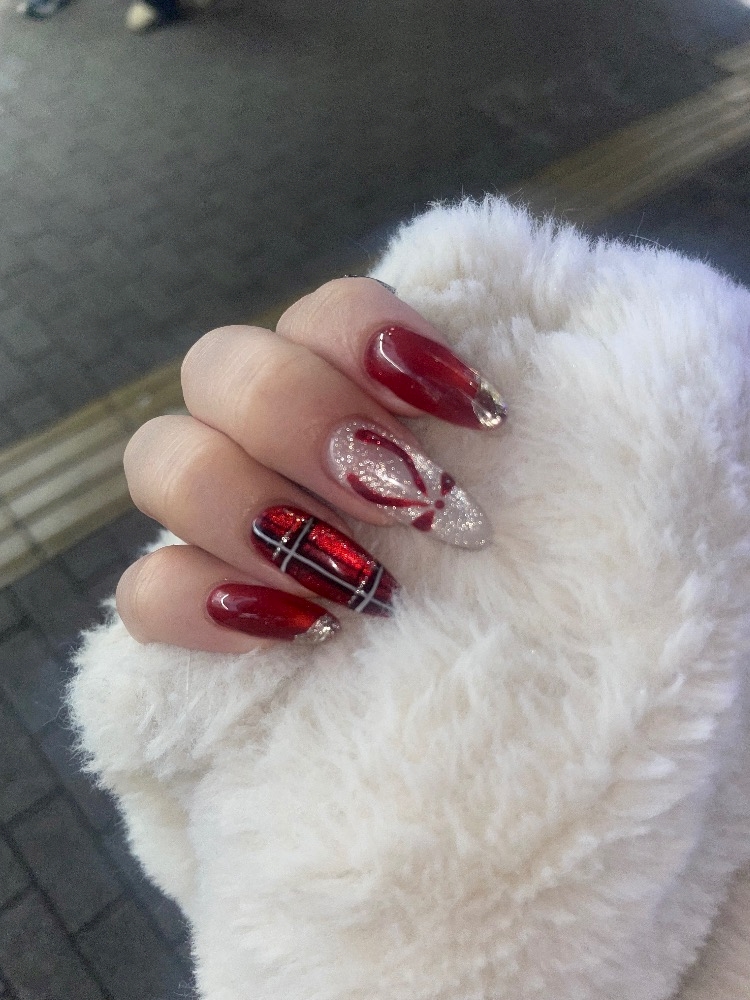 サンタコスに合うといいなーくらいでやったけどやっぱ爪がキラキラで可愛いのってテンション上がる(๑♡∀♡๑)✨
