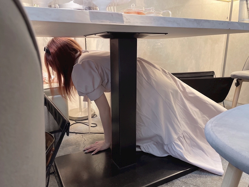 奥の席に行くのに狭すぎて通れない為、机のした潜って移動してるのを激写されたwwww