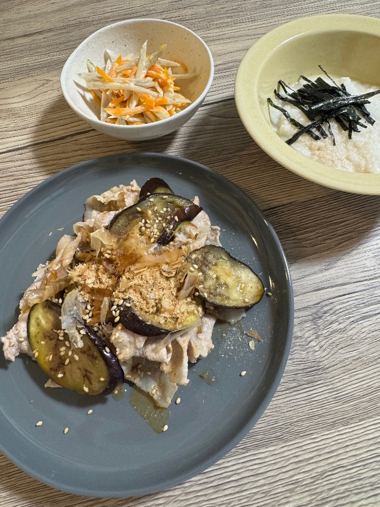 ナスをとろとろになるまで加熱して、ポン酢と白だしとごま油の調味液に豚しゃぶと和えました✨