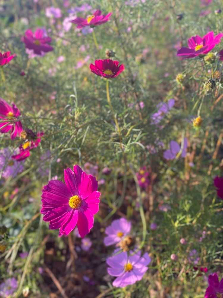 コスモスの花が 風になびいて、