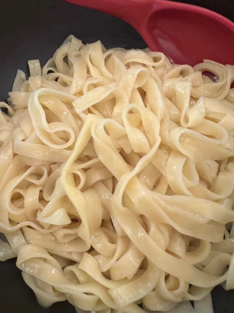 平たい麺でパスタみたいで