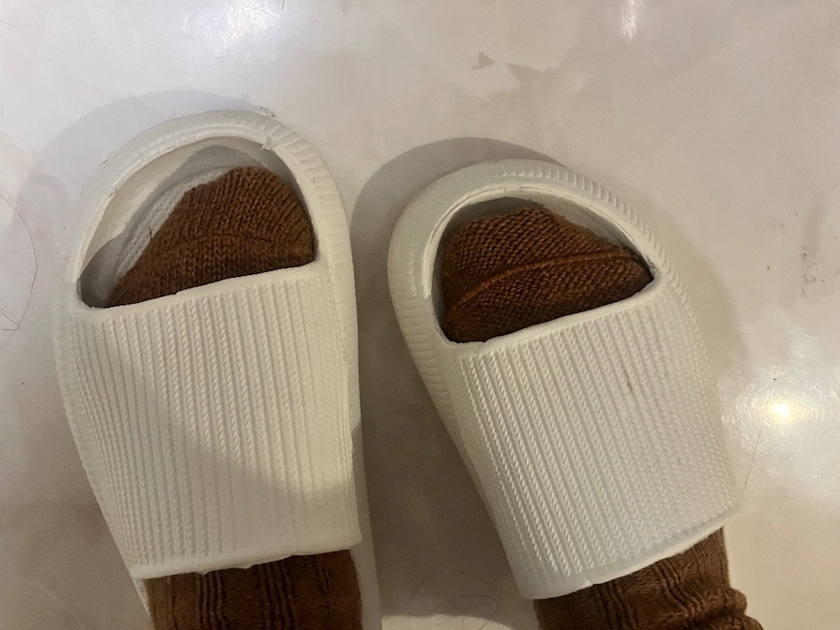 右足の靴下、裏表逆やんけ