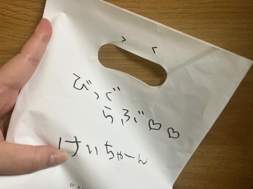 けいちゃんにお土産持ってきたから!!言うて