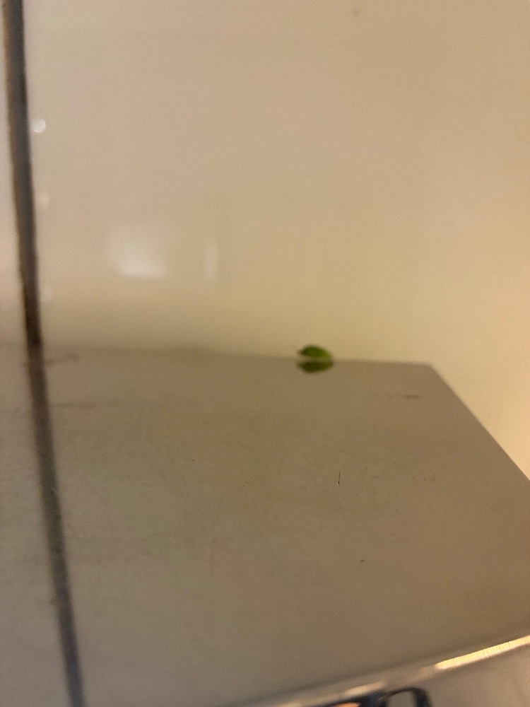 ふと棚の上を見たら、なぜか小さな葉っぱがぽつんと。