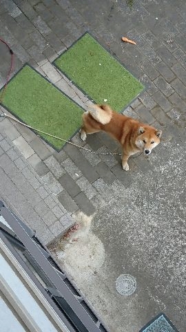隣の柴犬君がテラスに出ていて