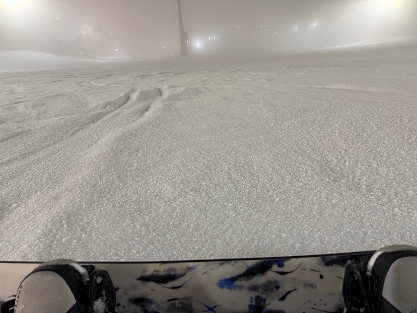 画質が悪くて分かりづらいかもですが、昼に溶けがかった雪が、夜にまた凍って、みんなが滑って削られて、こんな感じで透明で大小様々なまん丸の氷ができて、バーンは砂のようにさらさらな状態になります❄️✨