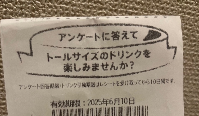 簡単なアンケートに答えたら次回トールサイズのドリンクプレゼントらしいです!