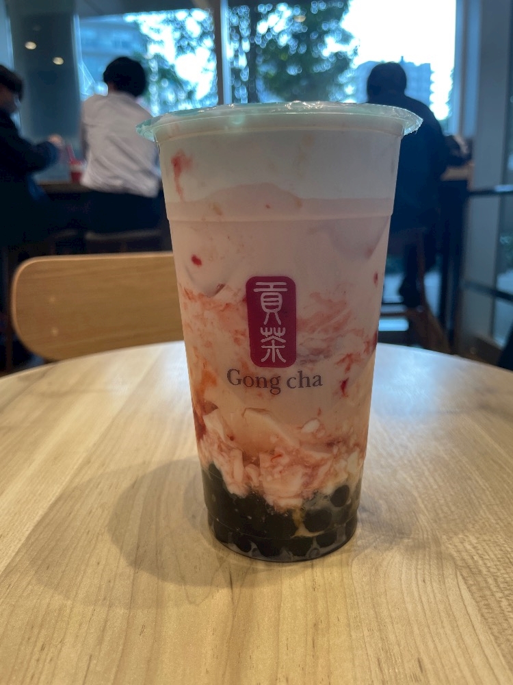 ゴンチャでいちご杏仁ミルクティーにタピオカ🧋をプラスして飲みました🥳