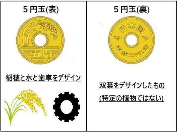 デザインに描かれている稲の絵は農業、裏の木の芽は林業、水の絵は水産業、穴のまわりのギザギザは歯車の絵で工業を表しているとのことで、日本国の基盤となる産業がモチーフとなっていて、意味深いデザインです。終戦後に焼け野原となった日本で、大砲の薬莢(やっきょう=火薬をつめる筒)を潰した材料から鋳造されて、「平和に暮らせますように」「産業が盛んになって国が栄えますように」という平和への願いが五円玉に刻まれました。