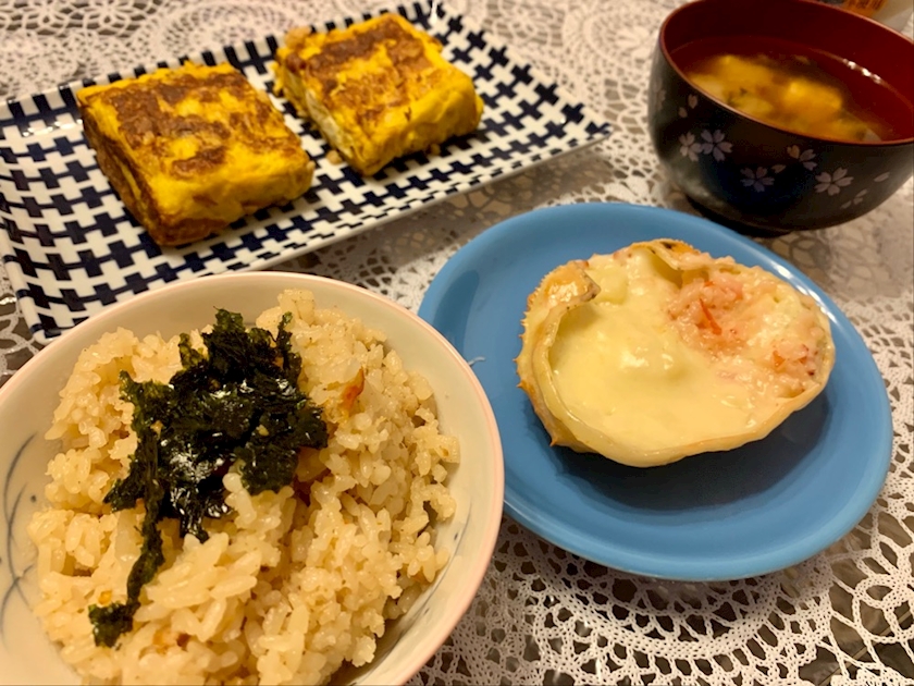 最近お土産でもらった、かにの炊き込みご飯と、かにグラタン♥️🦀