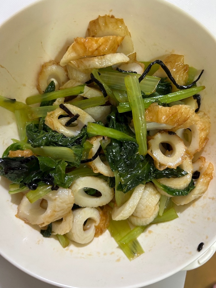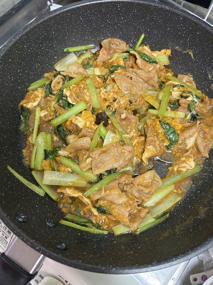 小松菜と豚肉と卵炒めたんだけどこれめちゃくちゃ美味かった😋
