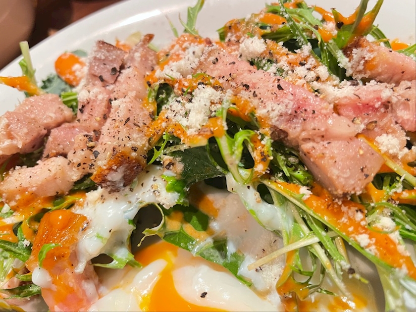 このサラダ苦めの葉っぱとかパクチーとか