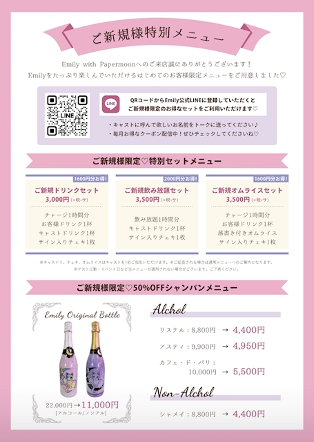 はじめてのご来店でも、エミリーをめいっぱい楽しんでいただけるように、とってもお得な特別メニューをご用意しております🐱🌙💕