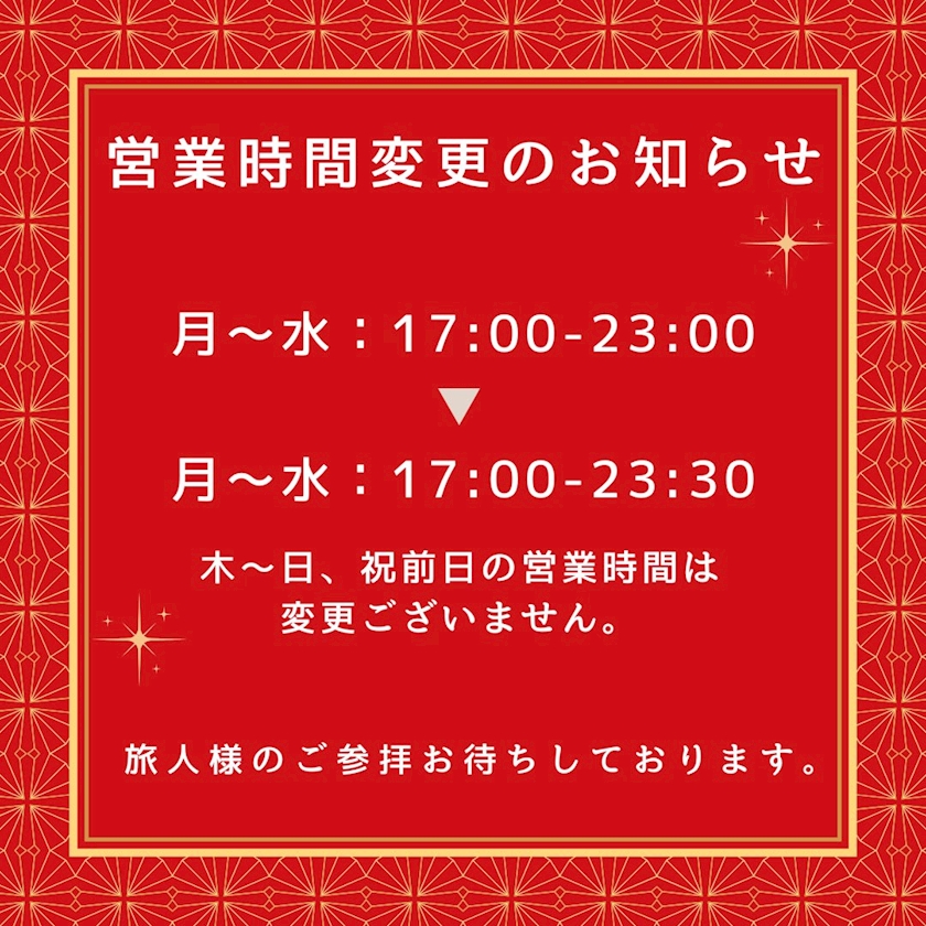 【月~水】17:00-23:00 【木~日・祝前日】17:00-翌5:00 |
