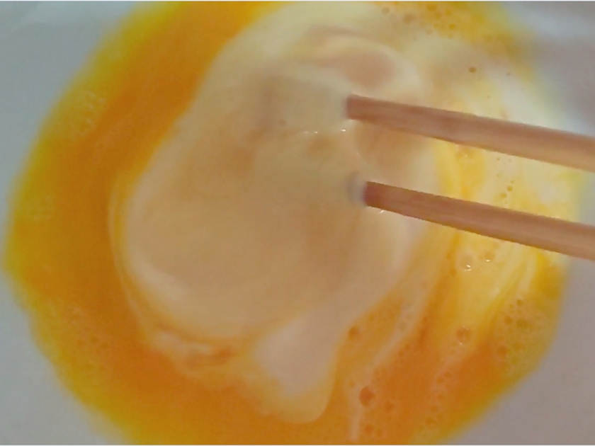 ②卵を割りほぐして、豆乳をまぜる
