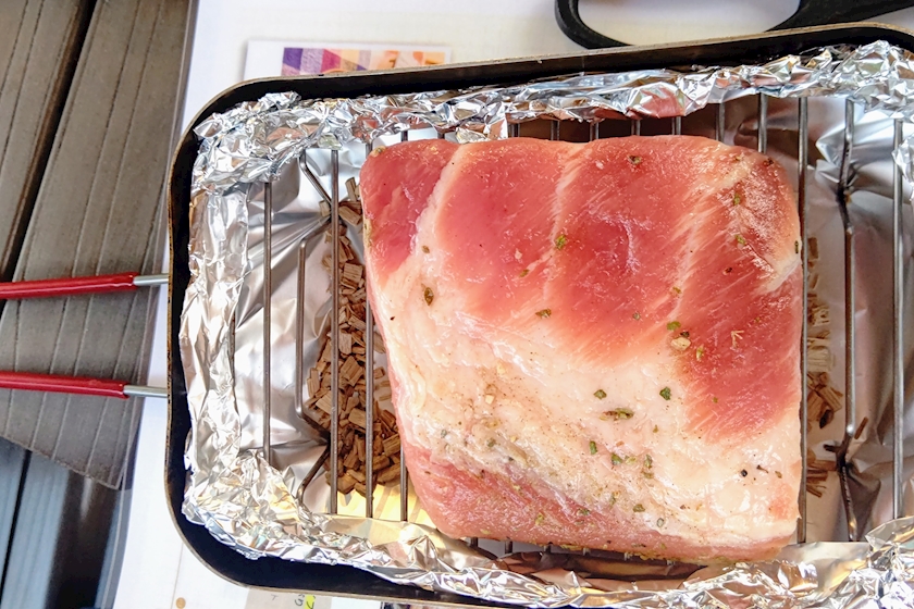 豚バラはメスティンにチップを入れて燻す