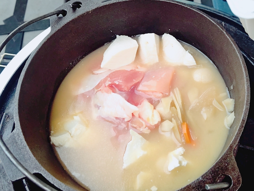 鍋に味噌スープをあけて、切りそろえられたお野菜、もも肉、豆腐をぶち込んで