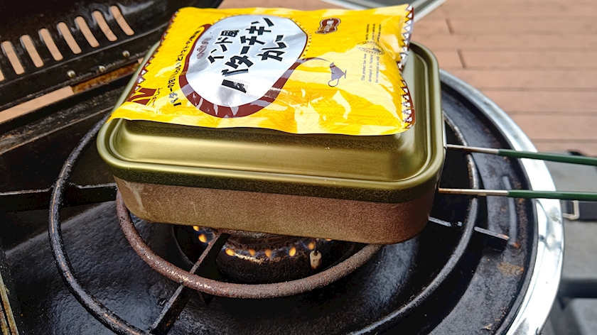 メスティンのふたで温めたレトルトカレーをかけて