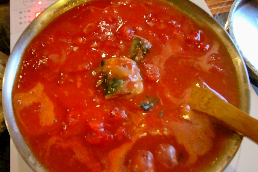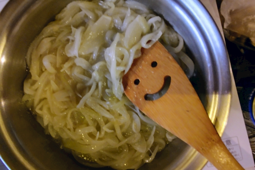 ②玉ねぎを飴色になるまでじっくり炒め、そこへトマト缶サバ缶を投入